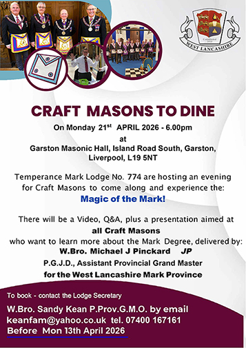| Take any and every opportunity to invite a Craft Mason to one of the Mark Presentations in your area or simply invite him to the festival board of your own Lodge. If at any Masonic meeting ask the Brethren in your company if they are Mark Men, some are not because they have never been asked. How many of our new Brethren tell you they wish they had joined earlier but had never been asked. Let’s take every opportunity to swell our numbers and IT IS WORKING. Some of our Lodges, that for a number of years had been static or struggling have recently found renewed life, Scorton Mark have advanced SEVEN candidates since May with regular and emergency meetings to get their new members advanced. All this because they have reinvigorated their views on recruitment. Arrangements are well in hand for PGL on the 15th April, a little earlier this year due to other commitments at the venue, The Winter Gardens Blackpool. |