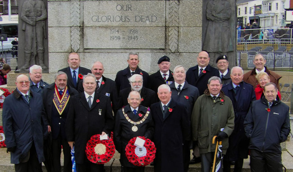 | The weather did not dampen the spirits or numbers of Brethren who attended the Cenotaph at Blackpool to mark Remembrance Sunday. Provincial Grand Master Keith Beardmore laid a wreath on behalf of the Mark Province of West Lancashire along with that of the Craft from the Blackpool Group, laid by Group Chairman Peter Bentham. |