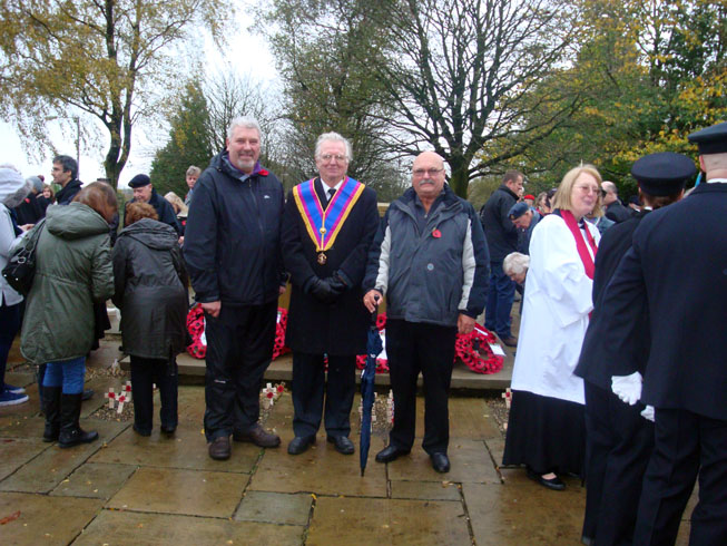 | On a blustery damp day, a two minutes silence was observed at 11-00am at the Monument to the fallen soldiers of the first world war outside the old railway works, then the procession wended its way through Horwich to the Cenotaph at Lever Park Avenue, where a short service was held and the laying of wreaths by the various organizations, a wreath was laid by the Mark Masons of Horwich, the parade then returned to the R.M.I. Club at the old rail works. |