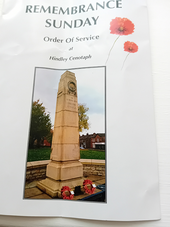 The warmth of Hindly MH had to be left behind however, to join hundreds of others participating in the parade. Such is the importance of Remembrance Day at Hindley, that even in the wet and cold of a dreadful day, members of the public turned out in great numbers in their wet weather gear and sporting their umbrellas to watch the parade make its way to the cenotaph within the grounds of St. Peter’s Church sited on the main Hindley crossroads.
