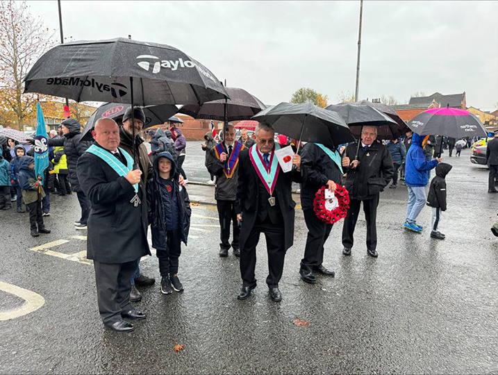 Regardless of the dreadful weather, we had upwards of 12 Hindley Masons braving the wind and rain to participate in the Remembrance parade and to witness the laying of the Mark poppy wreath.