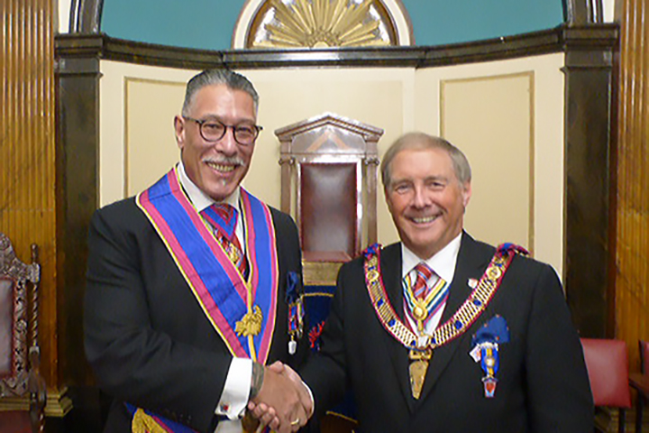 | WBro Les Norton, Provincial Grand Almoner and WBro Dave Richards, PGStB. The two Provincial Deacons for the night were WBro Jorge Perez and WBro Jeremy Clitherow. With the Salutations done and the minutes signed it was time for WBro Brian O’Hare to place his officers for the Installation ceremony. WBro Colin Mills took the Senior Wardens chair and WBro Eric Poole the Junior Wardens chair, while WBro Mark Lawrence took the role of Inner Guard. With the offices in place, the acting DC, WBro Derek Gaskell presented the Master Elect, Bro Paul Green to the WM for the purpose of Installation. |