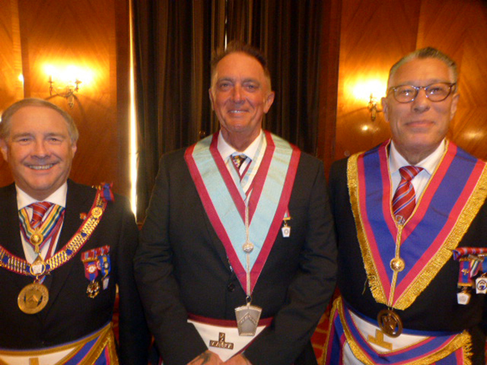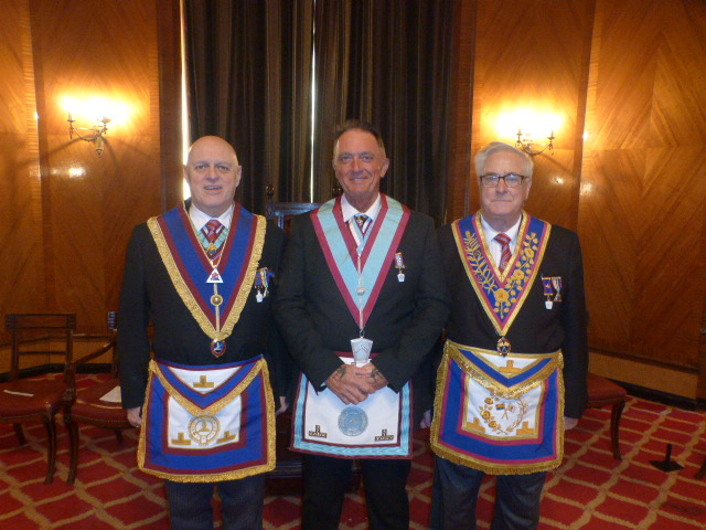 | As you would expect at a meeting in a posh hotel there drinks and nibbles before the meeting. The meeting was opened by the Master, WBro Alan Ball. With the minutes approved, WBro David Rigby entered the Lodge and announced the Deputy Provincial Grand Master, VWBro Giles Berkley who then entered in procession. | |