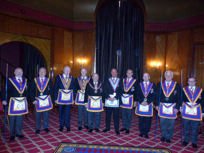 | On Wednesday, 8th October, Allen Pooley Mark Lodge held their Installation meeting. Attending the Installation was the Deputy Provincial Grand Master, VWBro Giles Berkley and he was accompanied by three of the Provincial DC’s team; WBro David Rigby, Deputy PrGDC; WBro John Askew and WBro Paul Shirley; Paul is also the Lodge DC for Allen Pooley. Also, in attendance from the Provincial team and acting as Stewards to VWBro Berkley were WBro Norman Lay and WBro Philip Pattullo; Philip is also a member of Allen Pooley Lodge. | |