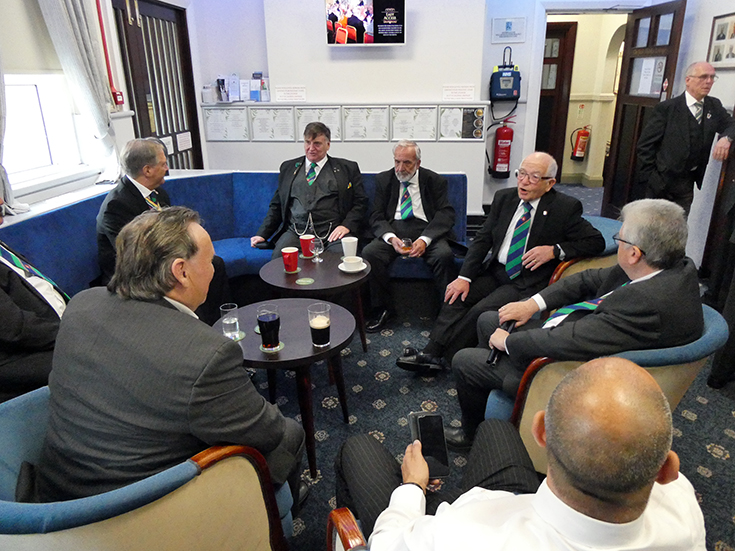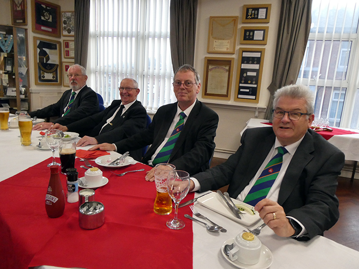 | The Lodge was closed and the Brethren mustered in the East for some photos and then onto the bar for drinks on the forecastle and then onto the poop deck for the festive board, which was lively with excellent food, banter and the usual Edmund Taylor good craic, which was enjoyed by all! | |