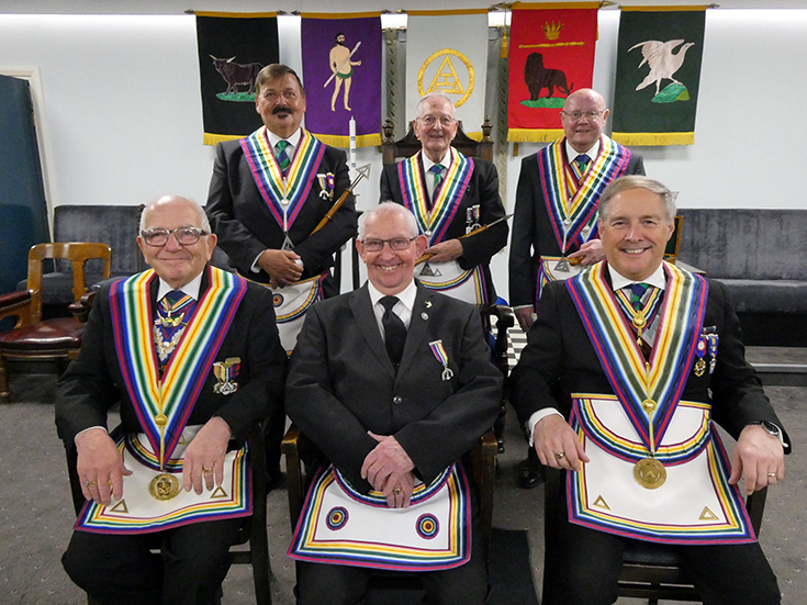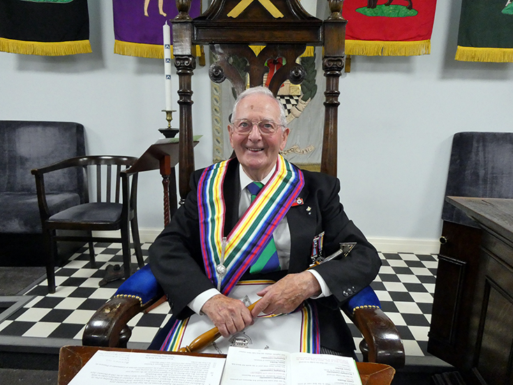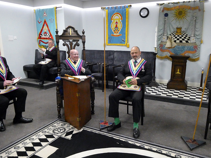 | A ballot was taken which proved in favour and then an excellent ceremony was carried out by the members of the Lodge, with Bro. Gitsham guided around the Lodge floor by Bro. James Rashid (SD) and Bro. Dennis Askam (JD). Bro. Alan Barnes (SW) gave an explanation and demonstration of the steps. | |