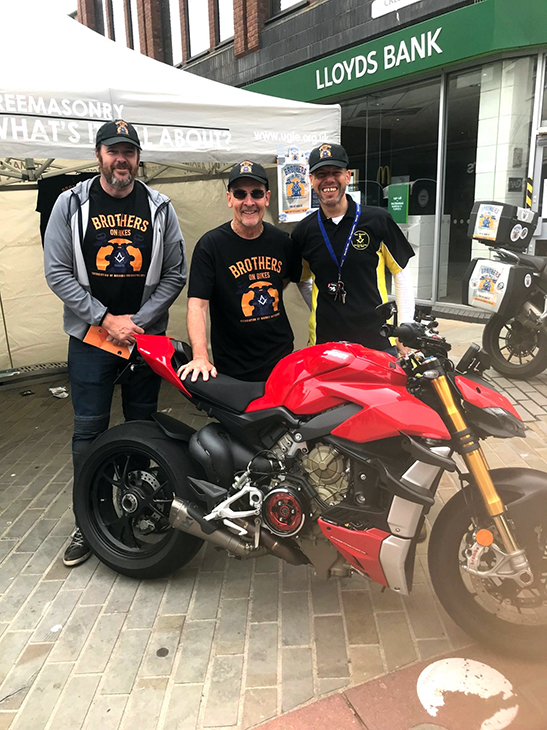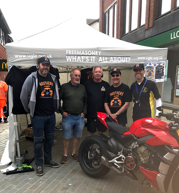 In an excellent position in the centre of the display of motor bikes were the members of Joey Dunlop Lodge of MMM. They had a display proudly proclaiming themselves as Freemasons and were ready to chat and answer queries from passers-by. They were particularly keen to declare themselves as Mark Masons. It was a pleasure to meet them. Dennis Laird IPM of The Furness Mark was passing by as I was arranging for a photograph to be taken so he was roped in to pose alongside me.