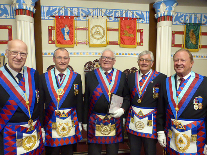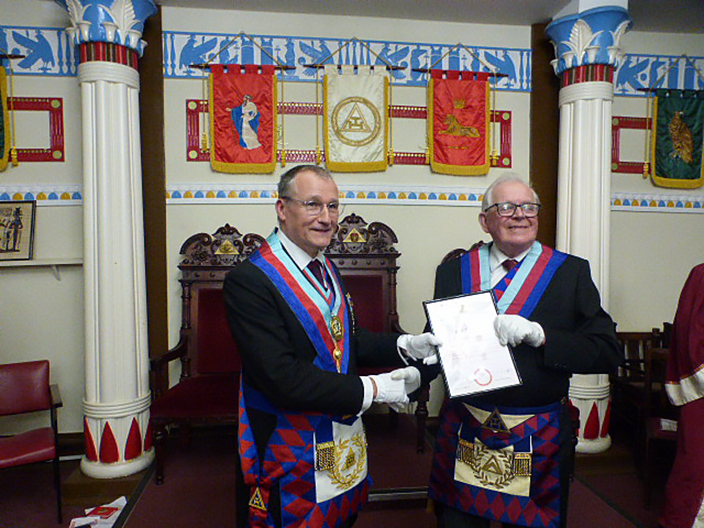 | E.Comp Ian Sanderson, AtoProvGP’s; (Ian is a member of Lebanon TI Mark Lodge), attended the meeting and delivered a potted version of Peter’s Masonic career; this was both informative and amusing. E.Comp Sanderson then invited, the Liverpool Group Chairman E.Comp Dave Johnson, (a member of Corinthian Mark Lodge), to read out the certificate that had been issued by the Provinces of West Lancashire and signed by the PGM/Grand Superintendent Mark Matthews, to commemorate Peter’s 60 years in the Royal Arch. | |