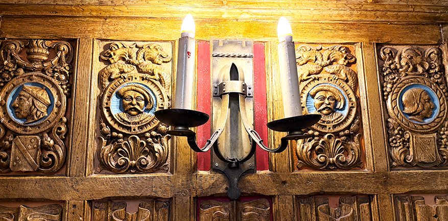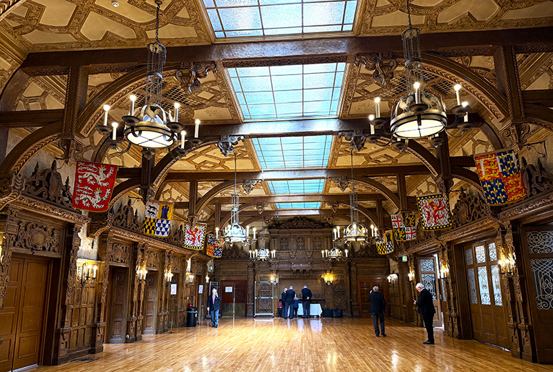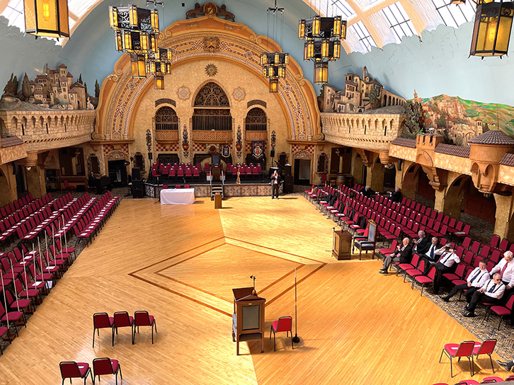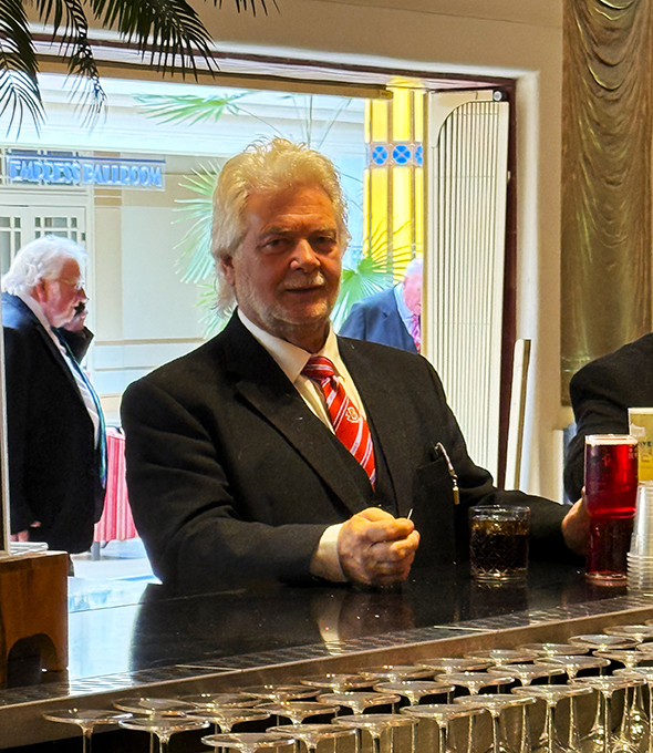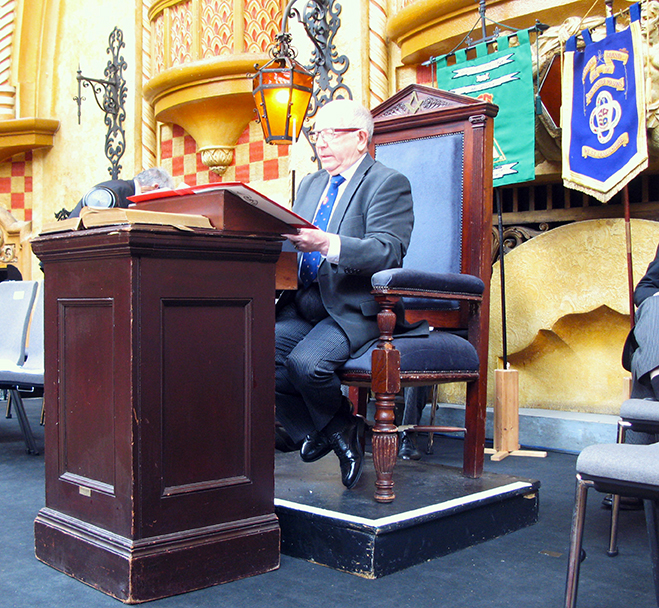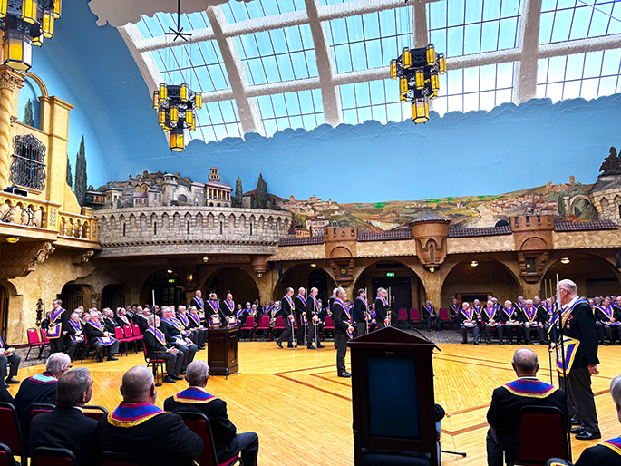 Checked in by the acting Stewards who were doing a great job, then it was up the very steep steps to get to the Spanish Hall, no actually on this occasion I went and found a lift (yes I must be getting old). There is a very pleasant, large anti room before you enter the Hall with some amazing statues embedded in the walls and a huge ornate fireplace and of course our very own W.Bro. Dougie Holgate the Prov Inner Guard selling all things Mark and Royal Ark Mariners.