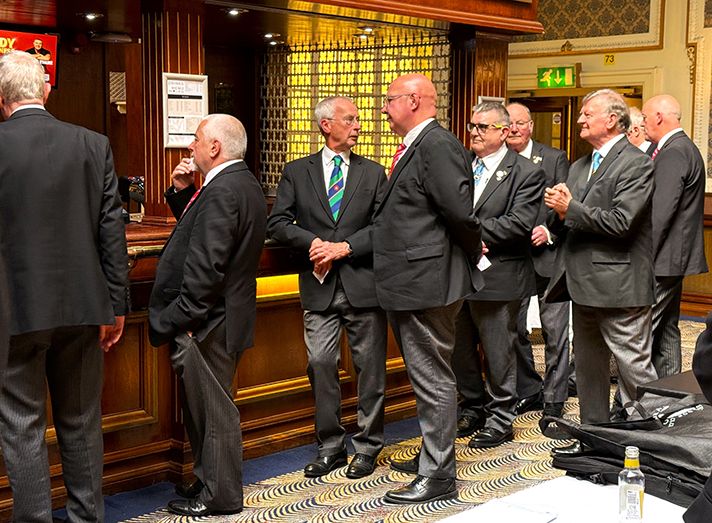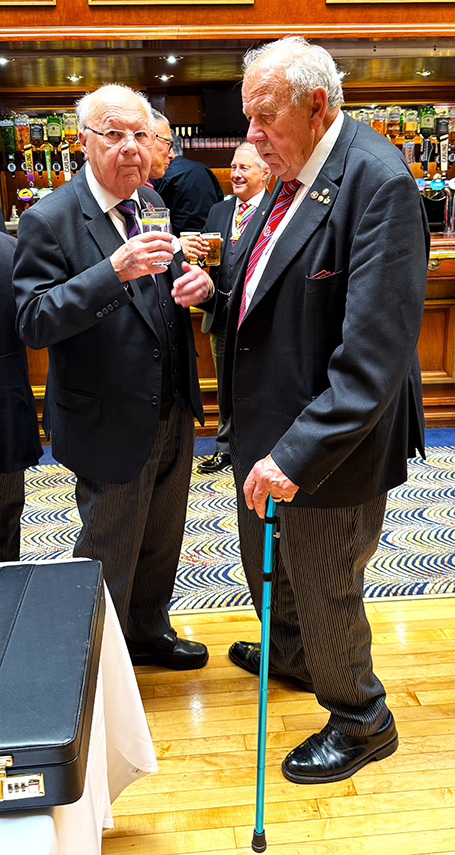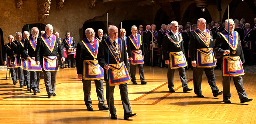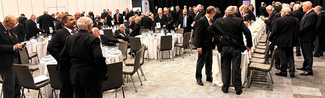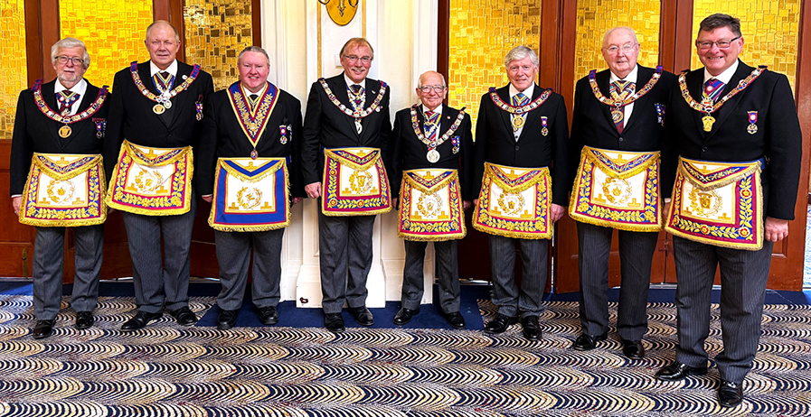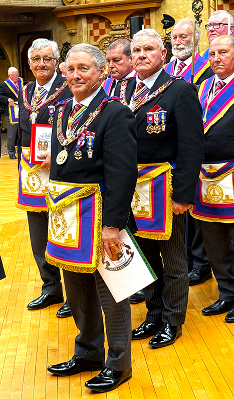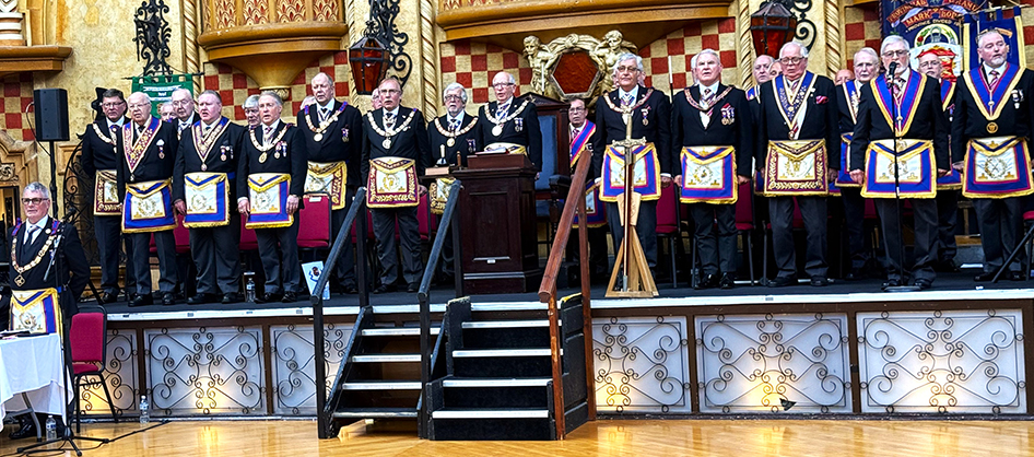 A brief resume of the meeting went as follows, to welcome the WM’s or their representatives from the Mark Lodges throughout the Province, next a Deputation of Worshipful Commanders entered. Our Provincial Grand Master was then Saluted following this in memoriam was read, several housekeeping items were dealt with, W.Bro. G,F, Berkley PGJD was Re-appointed Dep PGM, VW Bro. G.M.Bury PGJO and W.Bro.M.J.Pinckard PGStwd were Re-appointed Asst PGM’s. Other distinguished Brethren from Provinces all over the country were saluted.