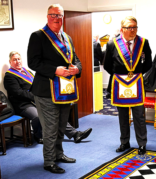 | The Mark Masons outside the door of the Lodge re-entered and saluted the newly installed W.M, Officers for the ensuing year were presented with their appropriate collars and had their duties explained, the usual addresses were then given in turn to the Wardens, the Overseers and finally the address to all present was given by our PGM. Keith gave his personal congratulations to the W.M. and wished him and all the members of the Lodge a healthy and happy year ahead. | |