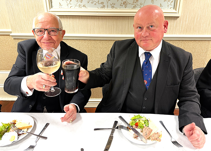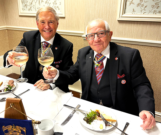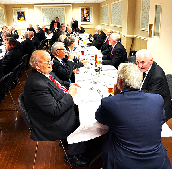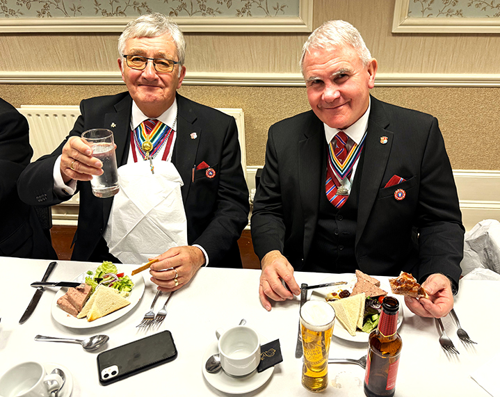 | It was now time for the PGM and Grand officers to retire from the meeting on its closing everyone returned for the usual photographs to be taken, to mark the occasion. Once this was done everybody made their way to the dining room, charged their glasses and took up their allotted seats for the Festive Board. A fine meal was served up by the very efficient and friendly hall staff. | |