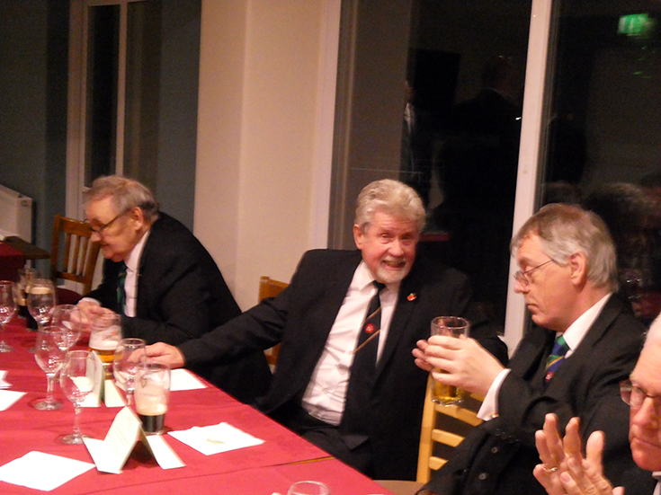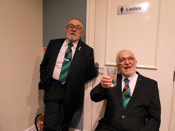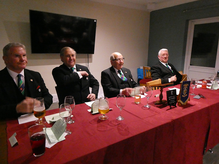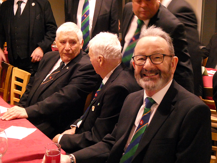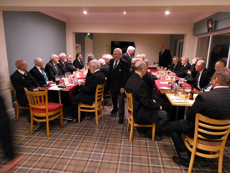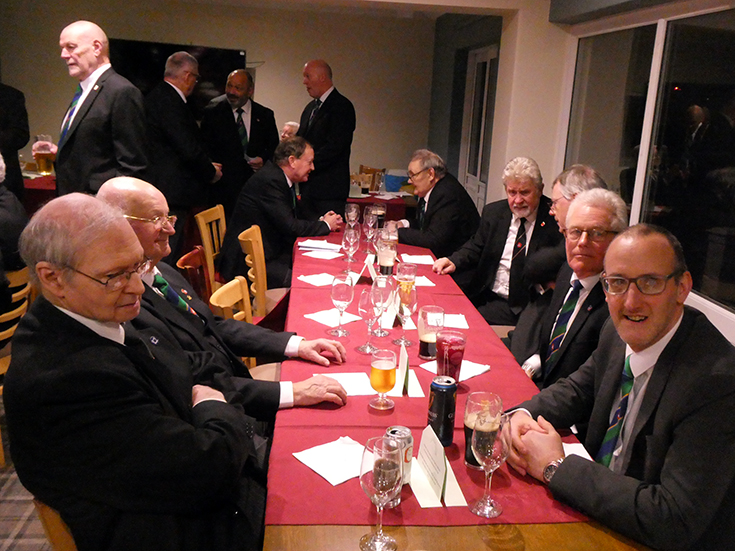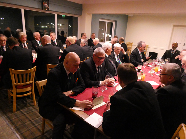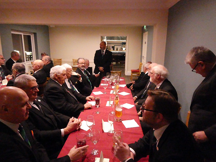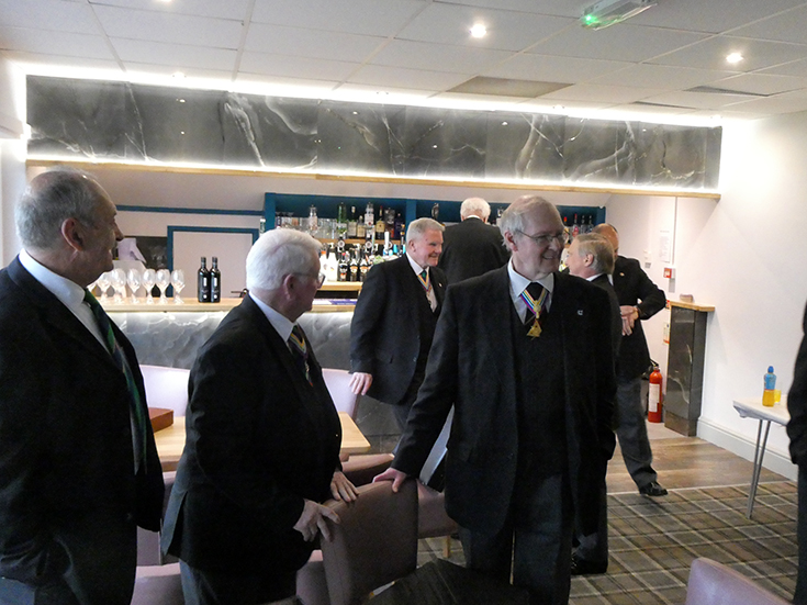| Following a collection for Masonic Charities, the Lodge was closed and the Brethren mustered in the bar whilst the assembled crew derigged the Lodge room and rerigged it for dining. | |