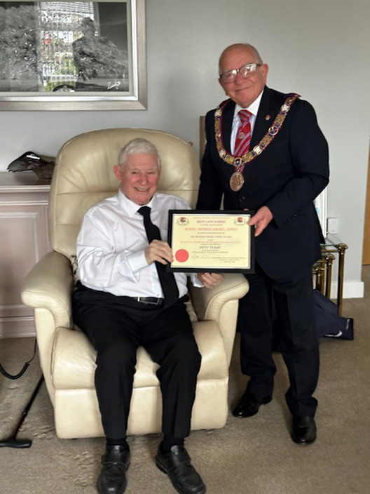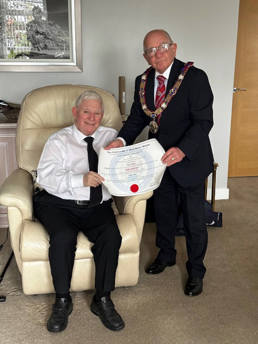 Today ( 11/2/26) I had the pleasure of visiting the home of V W Bro Danny Jones PGJO to present him with certificates from Grand Lodge and the Province to Mark his 50 Years as a Mark Mason, delayed by a few weeks as Danny and his wife Kath had been away cruising.