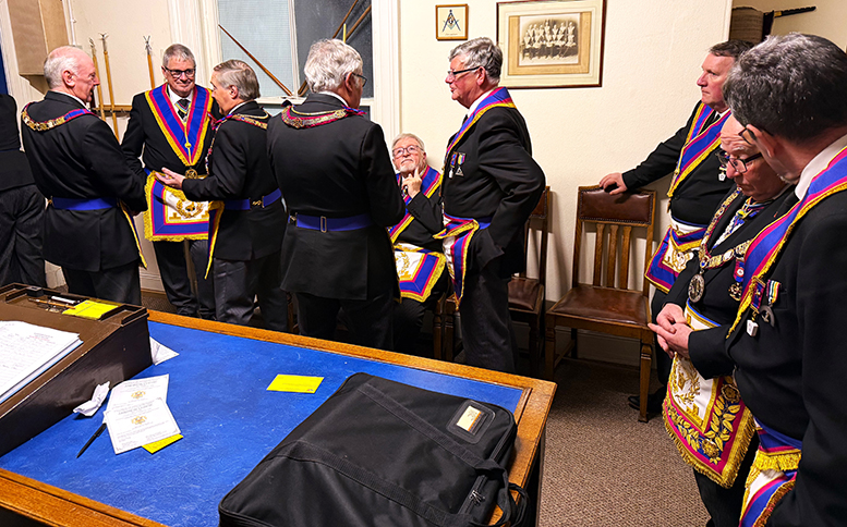 | Anyway back to the Team visit, arrived in good time lots of members and guests were already there having a drink and a good old chinwag, the meeting opened on time and following several housekeeping items had been dealt with the knock on the door we were all waiting for came, and the Inner Guard announced that our PGM was without and wished to enter, of course the W.M.M. was delighted to welcome R. W. Bro. Keith Alan Beardmore G.M.R.A.C. our Provincial Grand Master, along with members of the Provincial Team, and Grand Officers. |