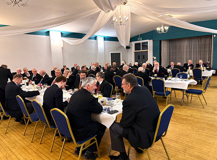 | On closing the Lodge, everyone returned for the usual pictures to be taken to mark the special occasion before making their way to the dining room, charging their glasses and taking up their allotted seats for the Festive Board. An excellent meal was served up by the very efficient and friendly hall staff, the usual Toasts and Responses followed including a new joke from our PGM, which on this occasion was funny!! | |