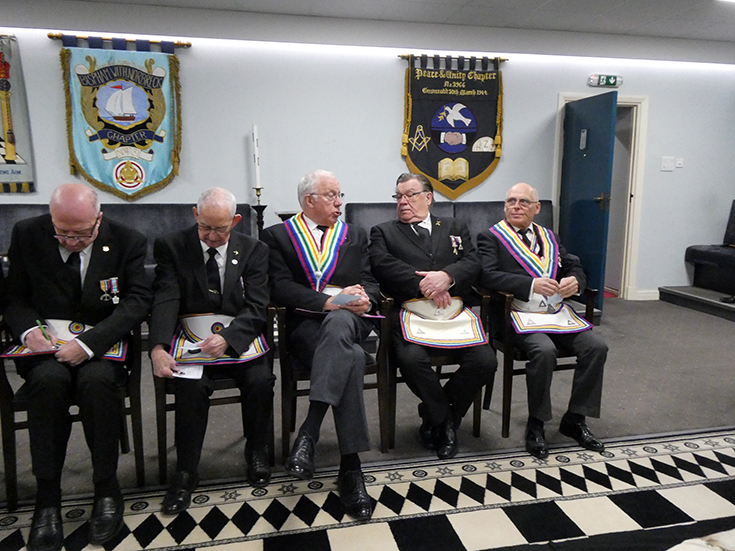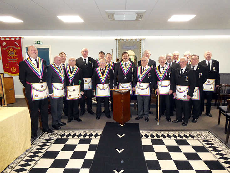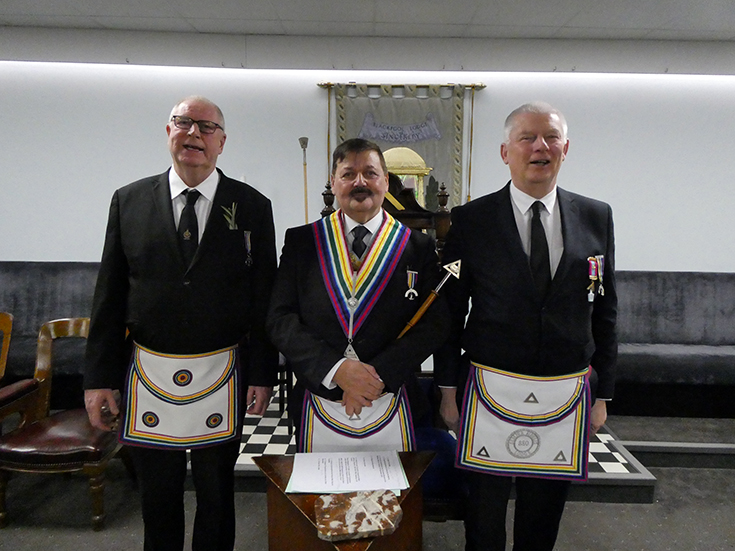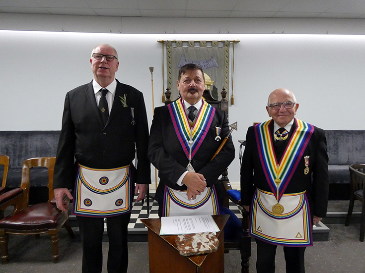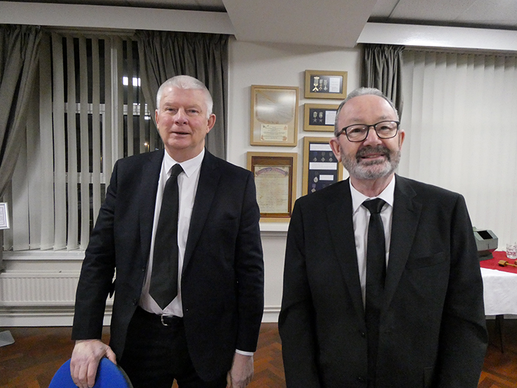 | The ballot proved in favour and then an excellent ceremony was carried out by the members of the Lodge, with Bro. Stevens guided around the Lodge floor by Bro. Dennis Askam and Bro. Chris Sage. | |