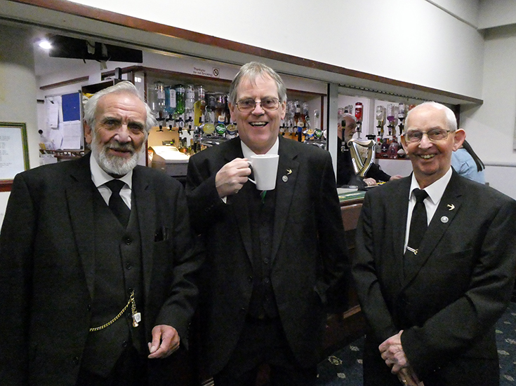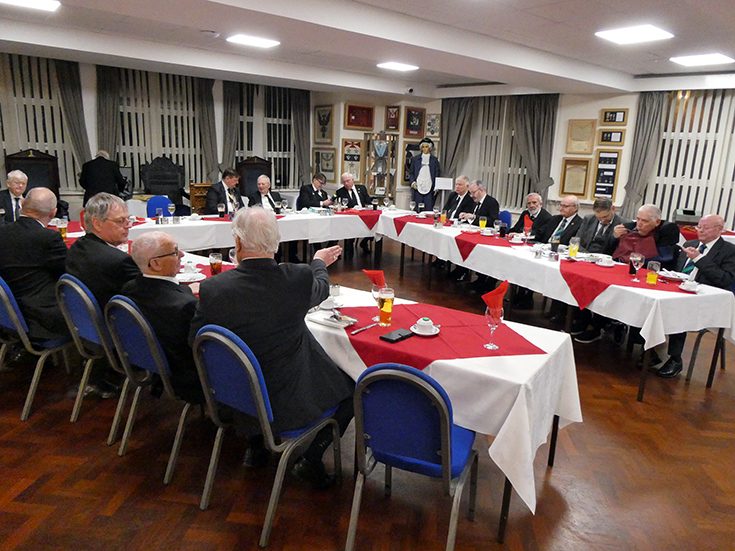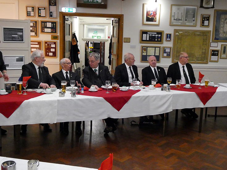 | The Lodge was closed and the Brethren rendezvoused in the East for crew photos and then to the bar for drinks and onto the festive board, which was lively with excellent food, banter and the usual Edmund Taylor good craic, which was enjoyed by all! | |