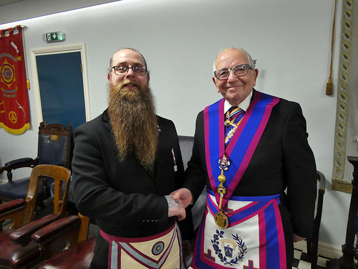 | WBro. Scott was delighted to accept and proceeded to advance Bro. Luke Bodenham into Mark Masonry with sincerity with the assistance of the Officers of the Lodge, with WBro. Roy Rhodes acting as a last minute stand in for the SD and WBro. Rick Clarke acting as JD. | |