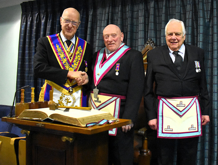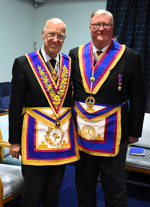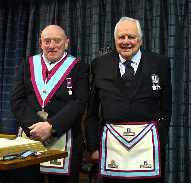 | For many years Frank and Harry have travelled together to masonic meetings and to see one without the other is somewhat of a rarity – a sort of senior Ant ‘n Dec duo!. This meant that the delayed introduction of Harry into the chair by Frank was undertaken with great feeling. | |