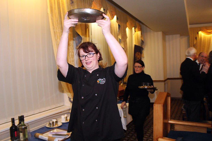 | The celebrant Robert Young McGown himself gave the address to the Haggis after it was piped in, being carried aloft - and then he stabbed it! I would like to admit here, I did not quite catch every word of the address, so I can't put a translation here! But it was magnificently delivered by Bob, to rapturous applause. |