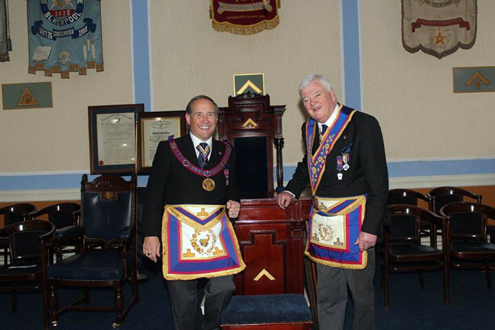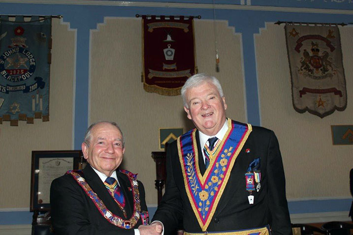 | His celebration was marked by a Team Visit to Fylde Mark Lodge, on Burn's Night, with the Provincial Team in strong attendance. What could be more perfect? After the Lodge was opened by the WM Brian Ogden (for the first time since he was Installed!) the Provincial Grand Master, Keith Beardmore took the Chair and welcomed his Provincial Team, to his own Lodge - a rare and special moment for him, and then he placed Bob McGown in the Chair, much to Bob's surprise! |