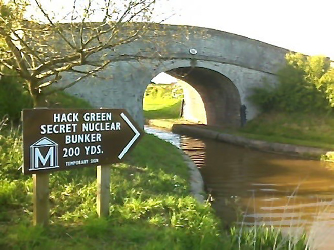| Heading through Hurleston Junction and over the Nantwich aqueduct much merriment ensued when approaching nearby Hack Green there stood a large sign giving direction for the ‘Secret Nuclear Bunker’. |