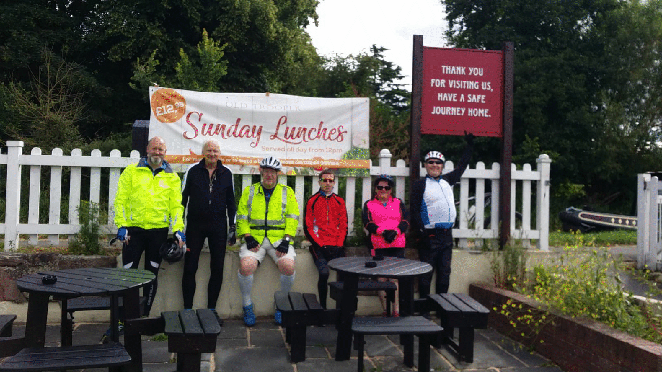 | It was here that the group took a break at ‘The Old Trooper’ - which many years ago had a fabulous sign depicting one of Cromwell’s Ironsides. Rowton Moor battlefield just a short walk across the field on the other side of the road to this building. On leaving ‘The Trooper’ it was 15 miles or so from Christleton they arrived at Barbridge Junction, and memories flooded back for those who had been on the 2016 ride, for now familiar territory was reached |