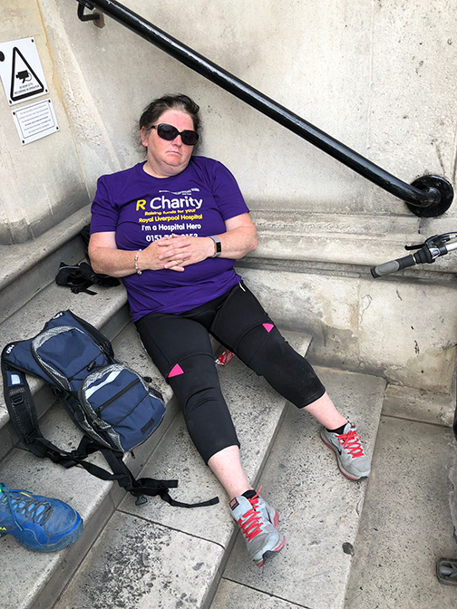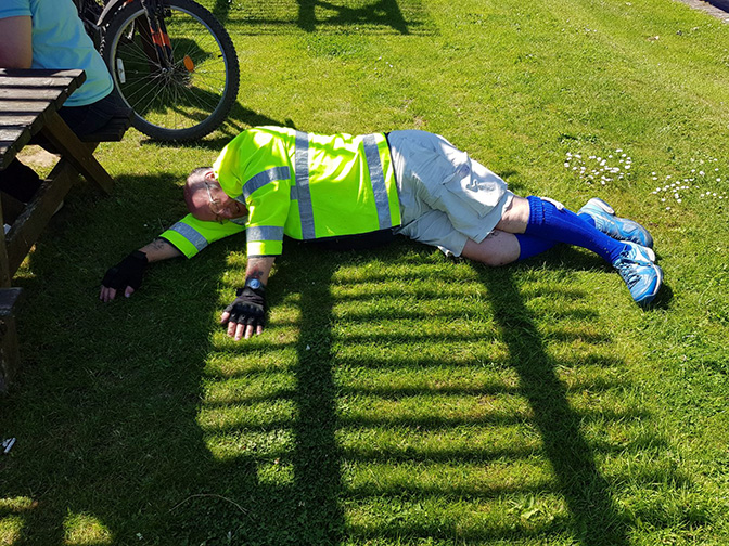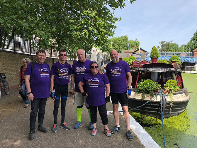 | Angela is an events co-ordinator for the ‘R’ Charity at The Royal Liverpool Hospital & until last year had never taken part in any long distance bike rides. Last year she led the cycling team along the Leeds-Liverpool canal and for the most part had done the same this year, facing every low hanging branch, thistle & thorn ahead of the other riders & it was their privilege to continue in her tracks for this last leg. |