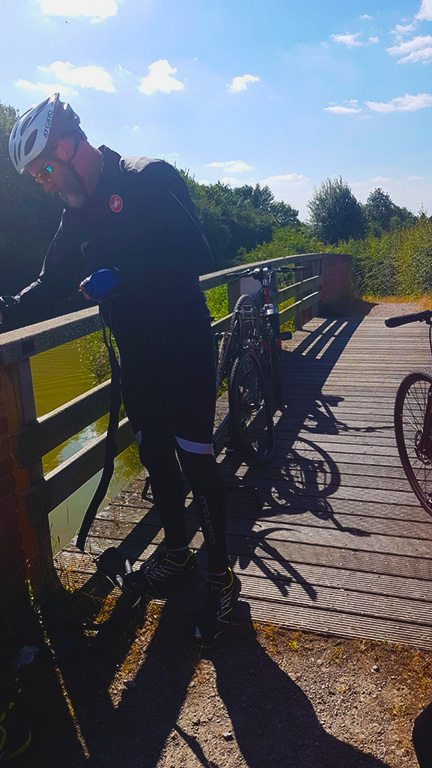 | Day 4 – the last day of the ride – dawns with the roar of aircraft from the nearby Heathrow Airport. All were looking forward to the gentle 20 mile ride into London that Chris Bruffell & Steve Walls had experienced in 2016 when last they rode this particular canal. |