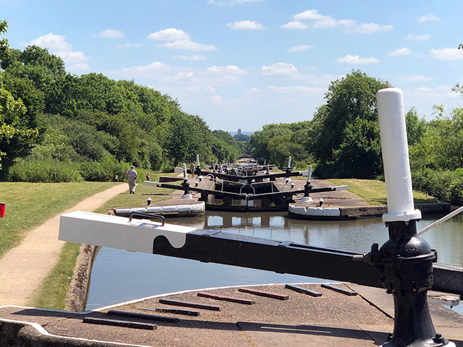 | Somewhat refreshed the riders continue on & can now look forwards to ‘Knowle; Lapworth & Hatton Locks’ – a series downhill locks which allowed the riders to rest some weary muscles during the descents & on towards Warwick. |
