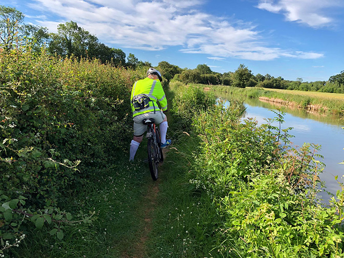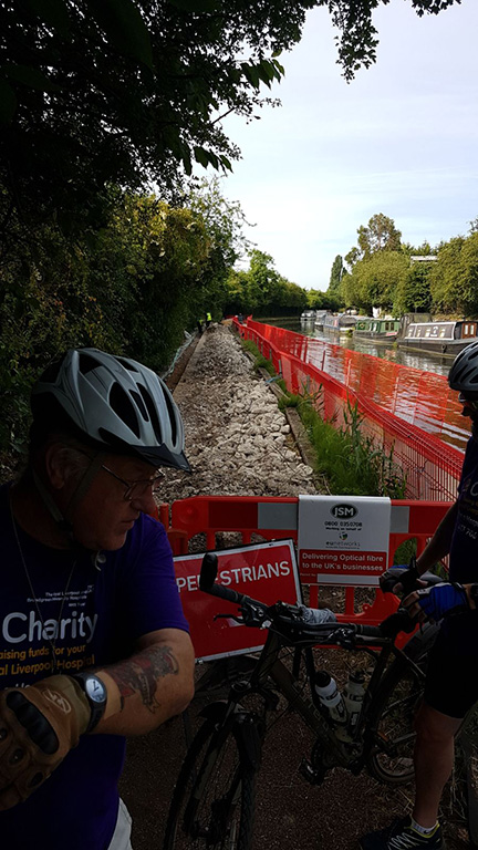| Amazingly there has been so much change in this particular area since 2016 with the towpath having been cleared & re-laid for most of its distance with work continuing even on the day when the riders experienced of ‘walking a 500 yard pontoon anchored in the canal whilst workmen laid a new towpath. |