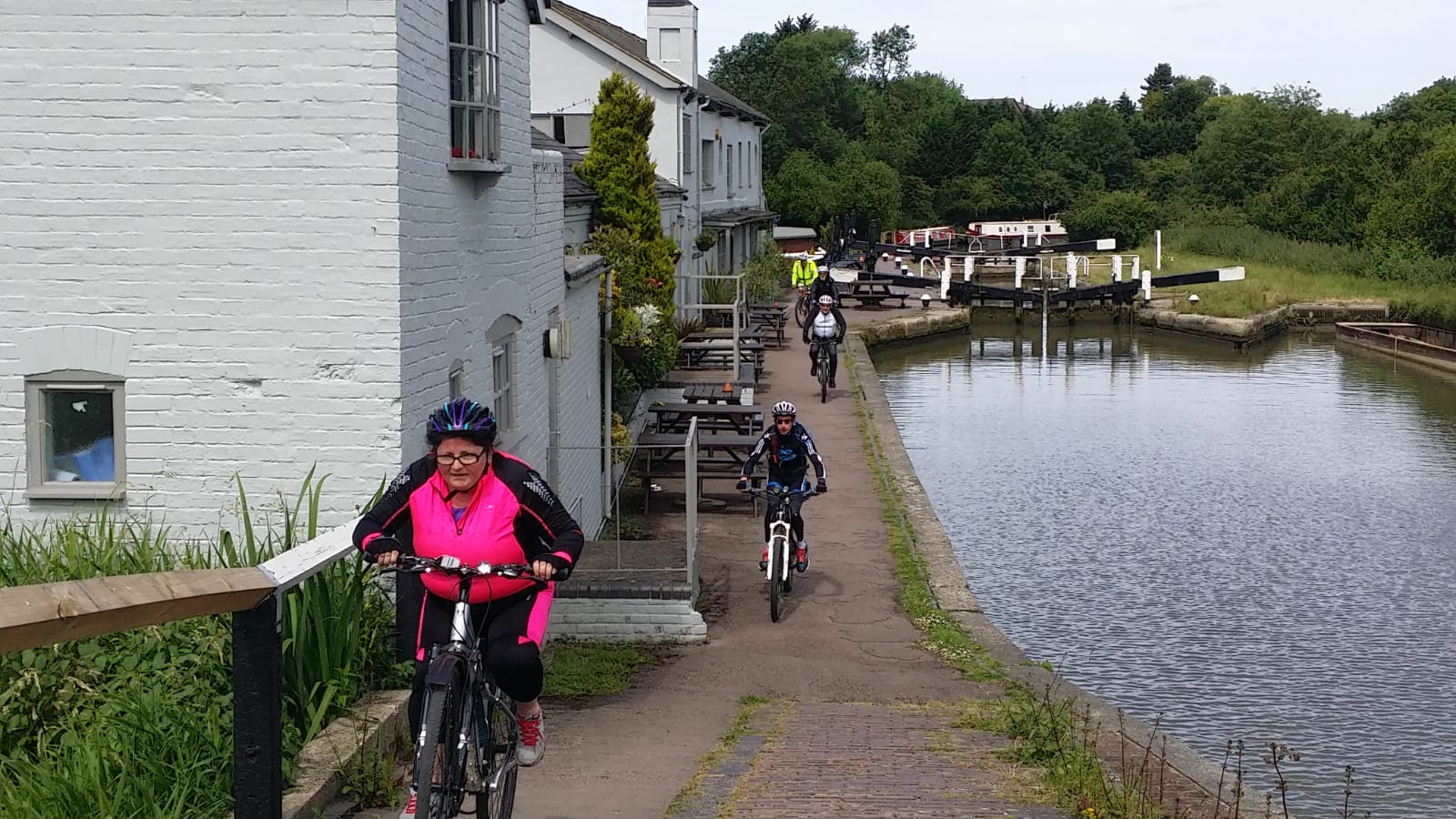 | Exiting Birmingham via the ‘Digbeth’ Branch the riders soon join the main line of The Grand Union Canal which would take them all the way to London & it was after leaving Birmingham city centre that the riders eventually met up with their ‘Support Team’ at ‘The Boat Inn in Catherine De Barnes for the lunch ‘pit stop’ |