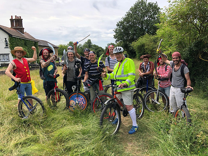 | It’s on this stretch of water that they are accosted by the ‘Pirates of Milton Keynes’ – a group of young men & one lady who dressed as Pirates were riding the canal on ‘omni-cycles’. Steve Walls having been ‘captured’ was held to ransom until such times as he identified himself as the Pay Master of ‘The Alt’ & demanded the appropriate proof from his captors. |