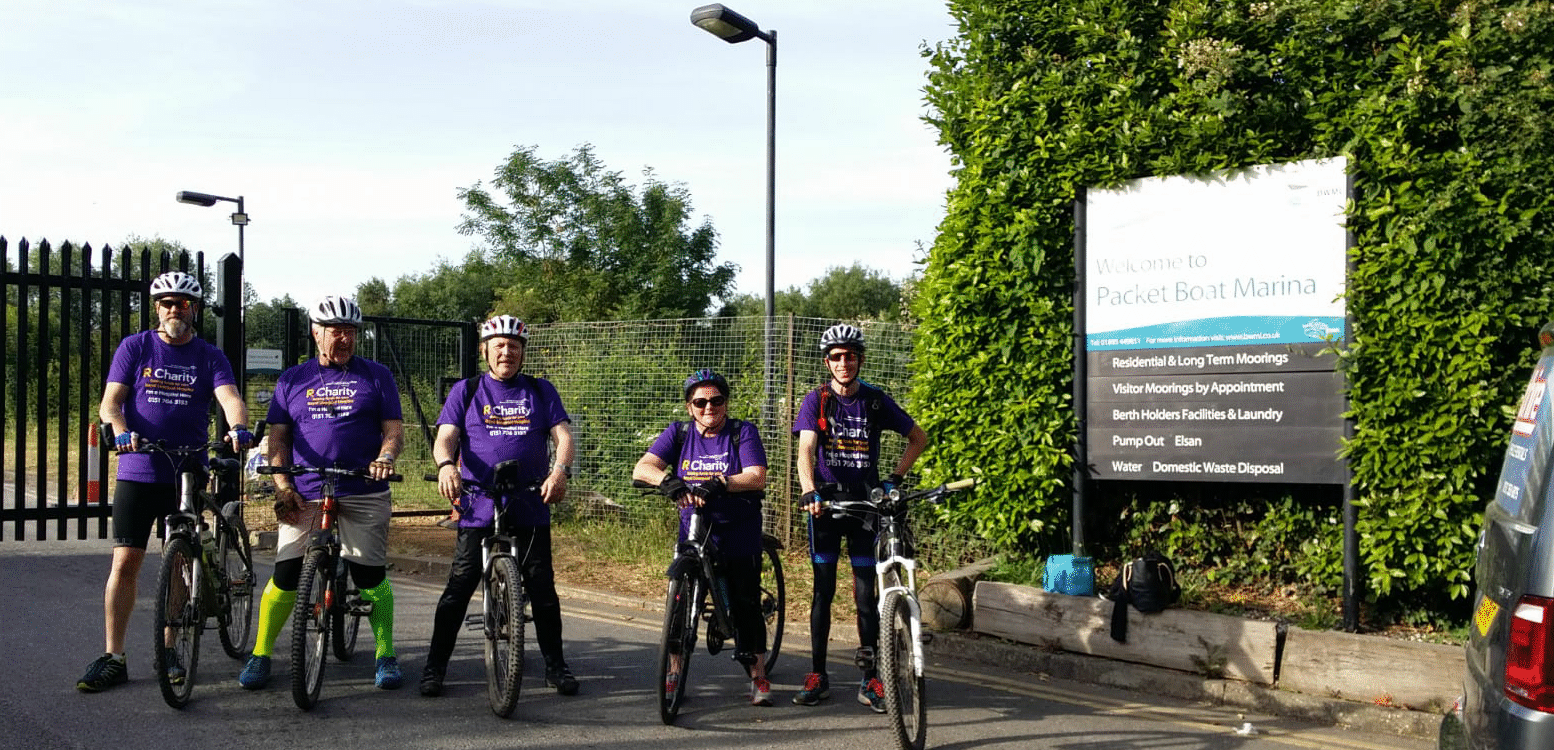 | Bikes unloaded, water bottles full & time for the first photo of the day outside ‘The Packet Boat Marina’ before the ‘star’ of the ride, Angela McShane from the ‘R’ Charity led the riders on the leg into London |