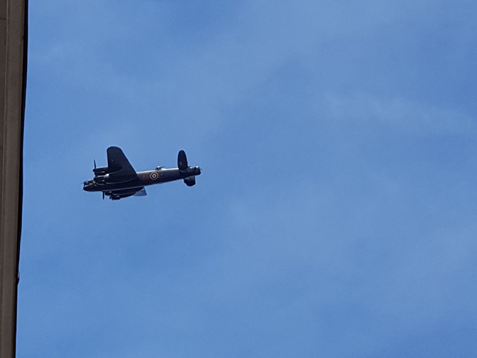 | To add to the occasion the RAF had arranged a flypast by a Lancaster Bomber which passed overhead as we awaited the arrival of the support vehicles which would transport most of the team home whilst Amanda & Tony Farrar would let ‘the train take the strain’ back to Blackpool after a pint or three in the Doric Arms (Pictures 10 & 11 ref: WA0004 & WA0009) |