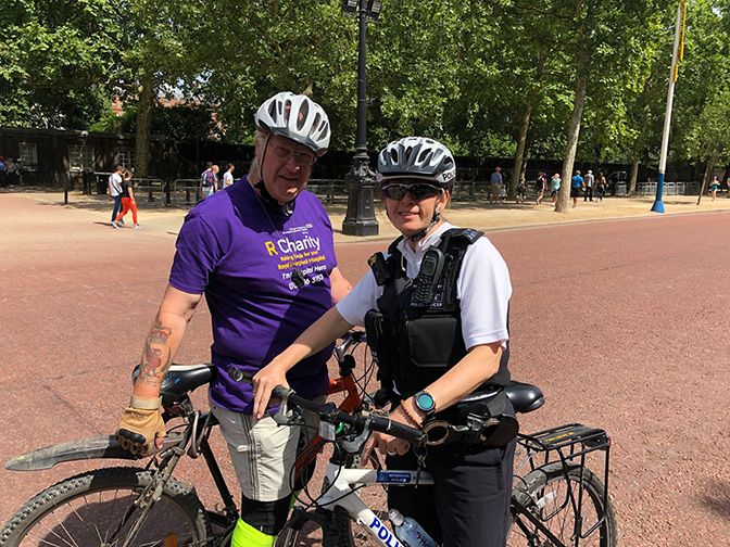 | Just as important to us though was that it was here that Angela had the 1st of 2 punctures within 200 yards. 1st puncture repaired, & Changing of the Guard’ having cleared the road, the riders passed the Victoria Monument & Buckingham Palace. |
