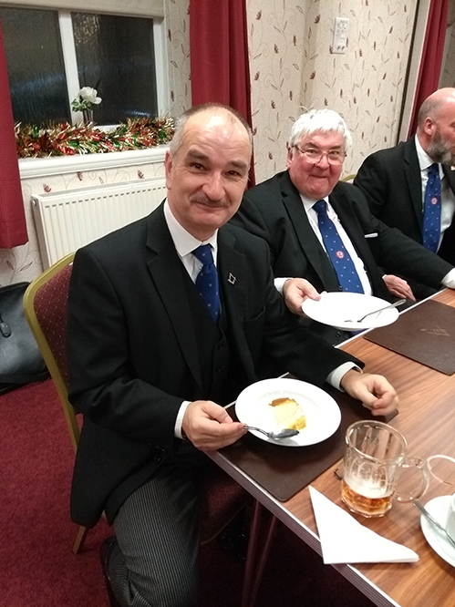 | Duncan responded by thanking Harry for his kind words and explaining that it had always been his intention to become a MMM as soon as time and circumstances permitted and he felt that now was the time. He looked forward to taking an active part in Lodge affairs in due time, and thanked all present for their attendance and support, especially Bro David Kenworthy WM of Semper Fidelis Mark No 880, Bro David Britton WM of Wyre Mark No 754, and Bro Brian Ogden WM of Fylde Mark No 296. Brian was making the most of his last night as WM as he installs his successor tomorrow! |