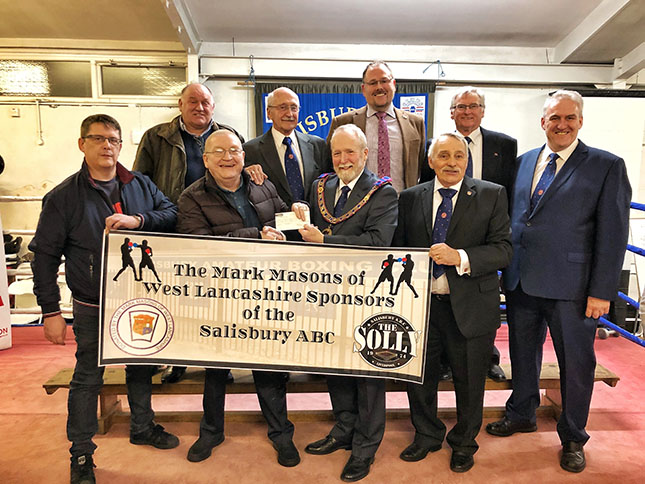 "Members of the Mark Master Masons of West Lancashire present a cheque for £3700.00p to assist Salisbury Amateur Boxing Club (the Solly) in the purchase of new equipment to help maintain their fantastic sporting achievements and high principals at their popular club in Liverpool" |