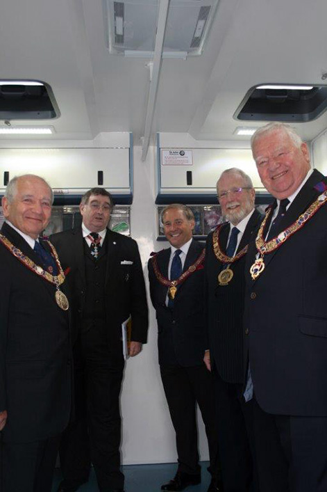 | We were so proud to see the defibrillator on the vehicle, and Keith Beardmore informed them of our own 22 de-fibs, donated by Mark members all around the Province. After a very welcome buffet we all departed Liverpool to return home, feeling very proud of all the fund-raising efforts by all our brethren, who made this wonderful and generous donation possible. Thank you to you all - you should be proud! |