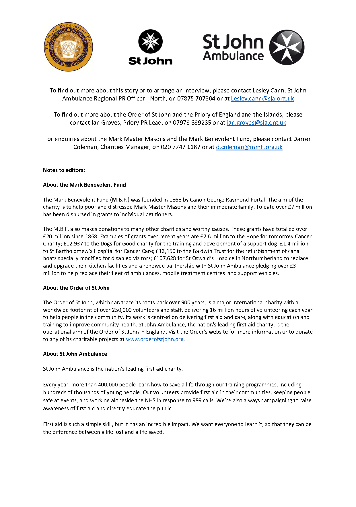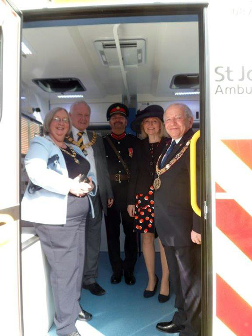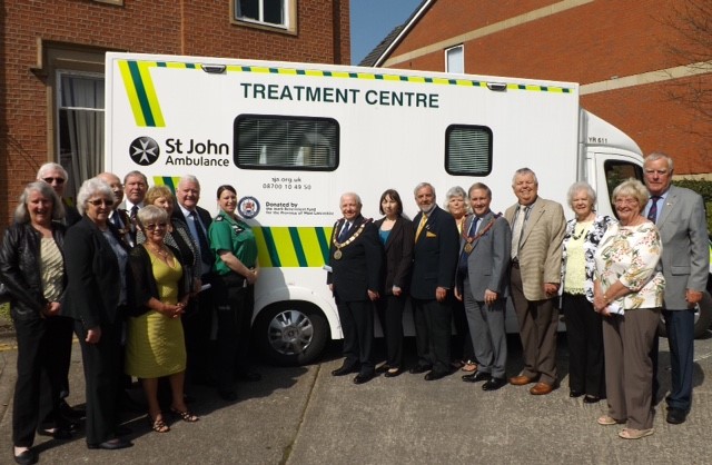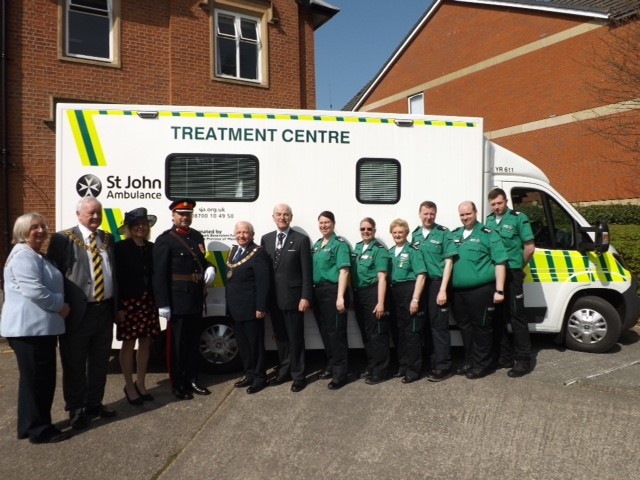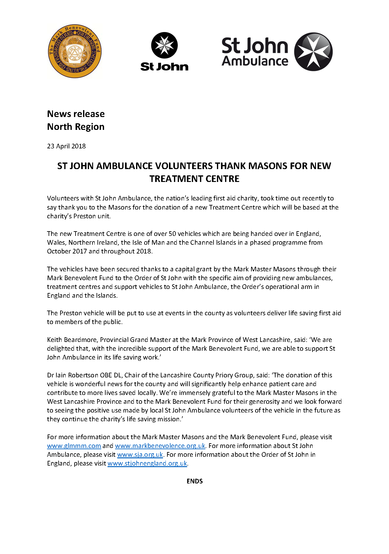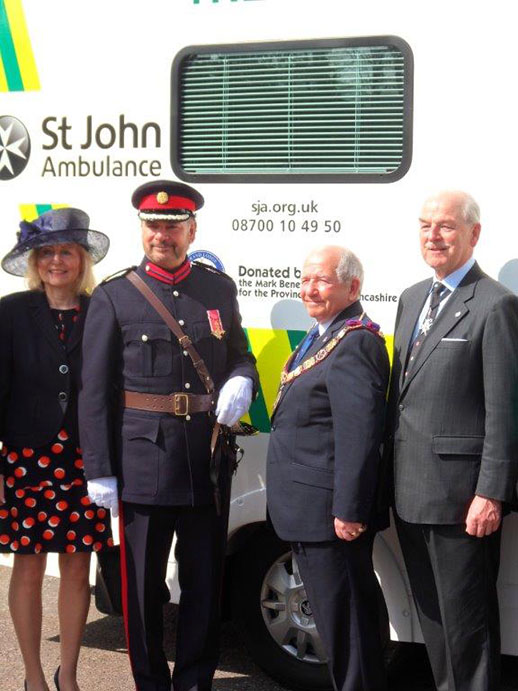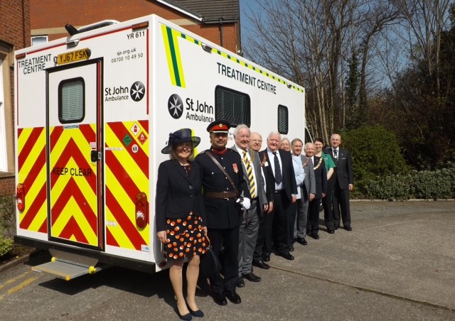 | On a beautiful sunny April morning the Provincial Grand Master Rt W. Bro Keith Beardmore, Deputy Provincial Grand Master V WBro Geoffrey Lee, Assistant Provincial Grand Master W Bro Giles Berkley and Provincial Secretary W. Bro John Bicknell along with their wives attended the official hand over if the first of the St John Treatment Centres at the Orders HQ in Preston. |