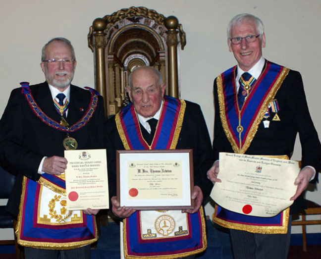 | Ian then surprised Tom and all the brethren present by promoting WBro Thomas Newton to the very high rank of Past Provincial Grand Senior Warden of the Mark Province of West Lancashire. |