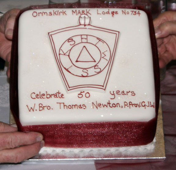 After the meeting closed the brethren retired to a very enjoyable meal where Tom was presented with a 50 year Mark pin and a cake to celebrate his wonderful achievement. |