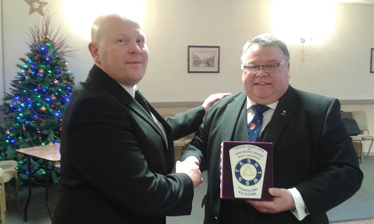 | On Wednesday the 12th December 2018 seven members of Red Rose Mark No. 1594 braved the not inconsiderable rush hour traffic from Hindley across Wigan to Pemberton to be welcomed as visitors to Rose & Thistle Mark No. 158, where they enjoyed a Demonstration Ceremony of Advancement by the W.M.M. Bro. Malcolm I. Bell Jnr. During the usual convivial Festive Board which followed, the Travelling Keystone was presented to Bro. Bell by the W.M.M. of Red Rose Lodge Bro. Ken Wilson. |