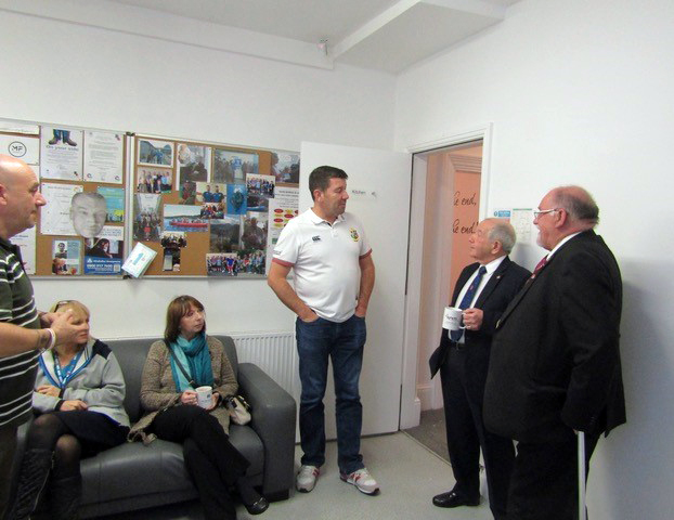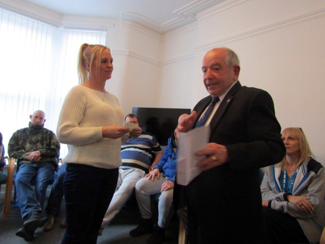 | The visit began with the clients of the project introducing them-selves, and giving a brief outline on the reason they are involved. All the people in the room spoke for one minute or less including our PGM and his wife, Colin Svenson and his wife Ann, Lisa who works at the local NHS medical Centre where most of the clients attend Jack Parker a local Mark Mason. This part of the day was very moving for all concerned. |