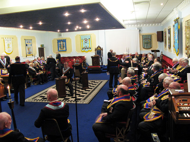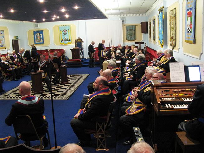 | Upstairs lots of activity many of the 250 plus members had arrived and were happily chatting away in anticipation of the meeting about to take place, the Lodge opened on time at 11 am with the W.M. W. Bro. John C Bicknell PGJD, ProvGSec in control, on this occasion he was accompanied by the IPM VW Bro. Rod Bennison PGJO and supported by Dep.ProvGM, V.W.Bro. Geoffrey H Lee, PGJO and Asst Prov GM V.W. Bro. Ian D Nairn. Once all the general summons items had been dealt with including the election of the WM, Treasurer, Charity Steward and Tyler for the ensuing had taken place W.Bro.Dr.P.A.Renton PProvGReg was invited on to the floor of the Lodge where he presented an illustrated presentation entitled “The History and Development of the Mark Degree” with a sub title “How the Solomonic Degrees were Split Assunder! This was received with loud acclaim and I’m sure that every Mason present had learned something about the long struggle which had taken place all those many years ago to establish the Grand Lodge of Mark Master Masons and the Mark Degree in general, excellent. |