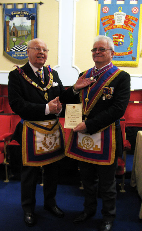 | Just before the meeting came to its conclusion I was very surprised to be called out on to the floor of the Lodge where I was presented with a collar and jewel as a Vice Patron of The Mark Benevolent Fund by DepPGM Geoffrey Lee who was kind enough to say some very nice words about all my efforts not only in respect of the Mark Degree but with regards also to the work I have done in creating the new Masonic Hall in Urmston, Manchester as Chairman for the past four years, holding this position himself and being very experienced in business he completely understands the endless hours and thankless tasks needed to keep things going in this day and age. I was moved by his words for which I sincerely thank him. |