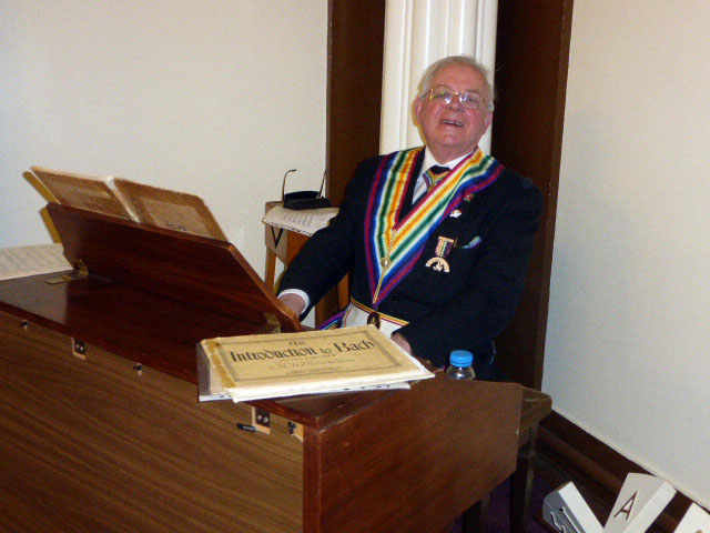 | This also meant that the usual lodge room normally used by the Lodge was not available and so on this occasion the meeting was held in the ‘Egyptian’ room which is almost exclusively used as the ‘Chapter Room’. With the lodge room set out for Adoniram’s RAM Installation meeting the members and visitors gathered and with a couple of visitors sitting to make up for missing members and a guest organist for the night, one PPGM RWBro Peter Connolly, (who said “His Bach was better than his bite”). |