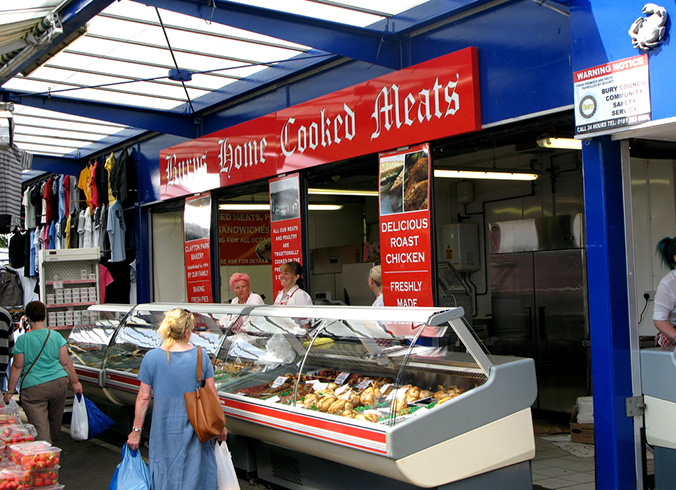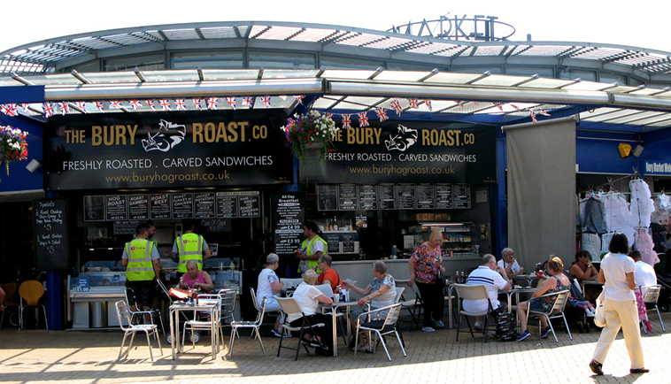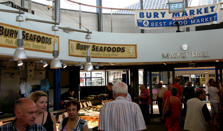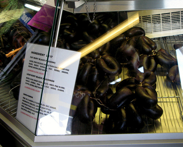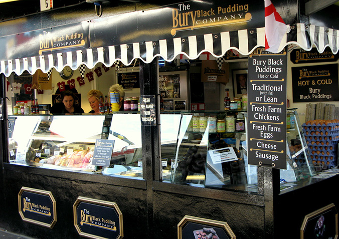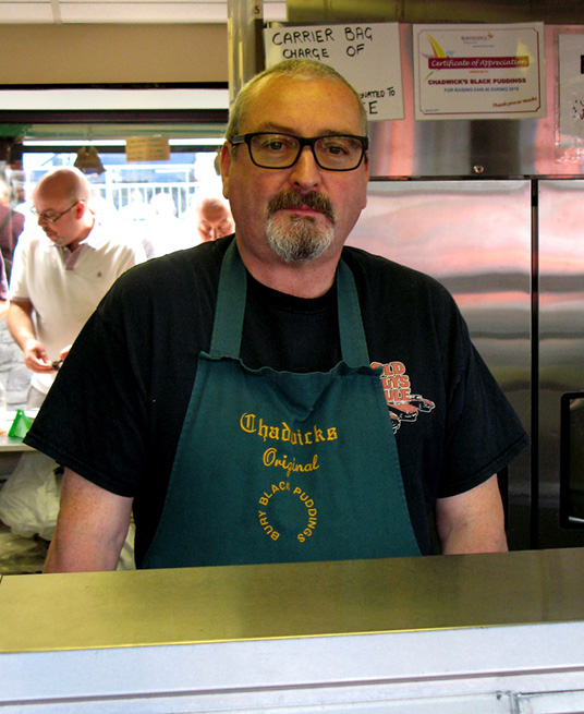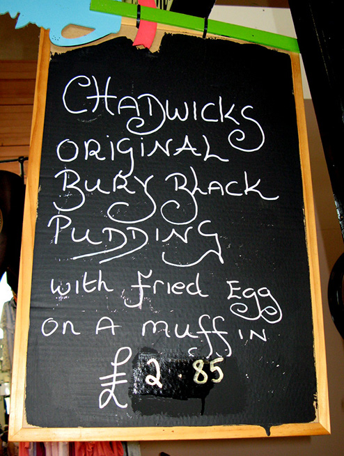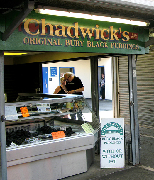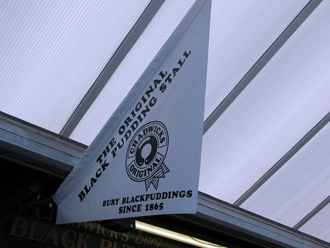 | To say this shopping area is massive is an understatement, every kind of product you can imagine, the Market just goes on forever, passageway after passageway, fresh foods of every description, lots of cafe’s indoor and outdoor catering for all tastes, wonderful cake stalls, bread stalls, everything including of course the Famous Original Bury Black Puddings, one stall Chadwick’s is manned by, yes you’ve guessed a Merry Mason, they have been making them since 1865, not him personally of course, the other top class stand close by is the Black Pudding Company. There is a Fresh Fish and Meat Hall, and all the usual shops to be found like the type you will find in towns all over the country, I could go on forever but I think it would be best to let the pictures do the talking, besides all the stalls it is full of local character and characters, I found one such person when I sat at a very up market cafe which seated at least 20 people for a lovely bacon barm, he apparently goes there every day for the same sandwich, yes everyday!! |