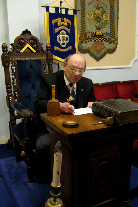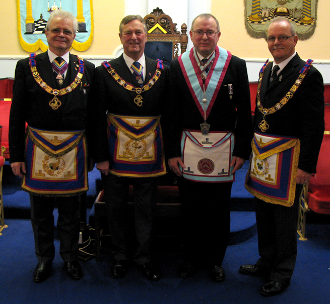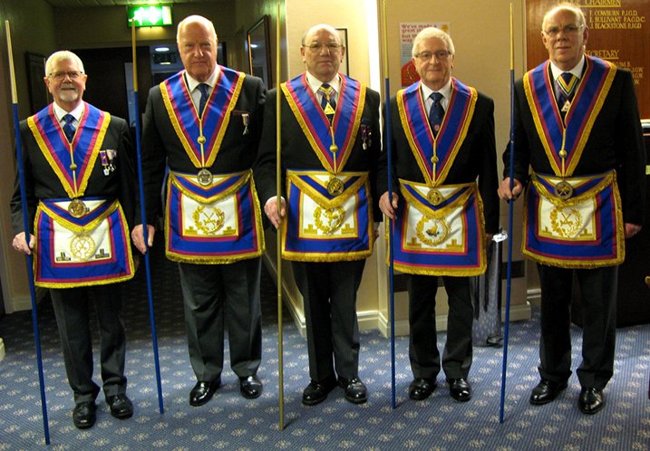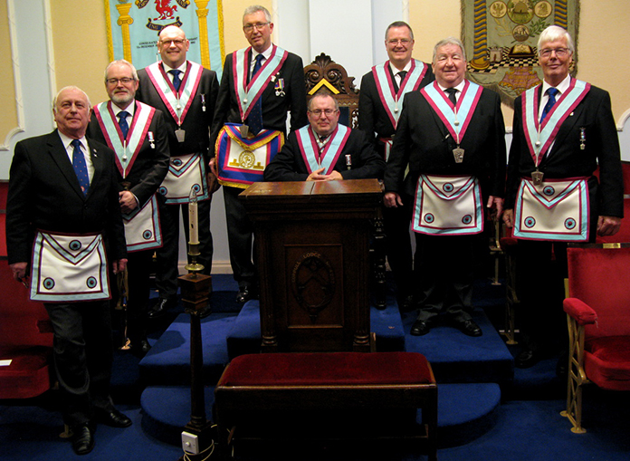 | The meeting was opened on time by the WM Bro. G. McKay at 6pm and before I could blink it went into Festival Mode, the DC W.Bro. Jim Hustler PPrSGD was placed in the WM’s chair and became the Quiz Master for this one off Final of “Who wants to be a Builder”, seats and tables were brought in for the teams, one consisting of Craft Masons the other made up of Mark Masons, following on from some early argie bargie between them lots of questions were put to them in turn including such as “What is a corkscrew” and “where did they receive it”, “name the two advertisements hung at the door of the chamber”, much laughter from all present and to tell the truth I can’t remember who actually won (I think it could have been the Craft) unfortunately I couldn’t photograph proceedings for posterity as the Lodge wasn’t called off, never mind I’m sure you can use your own imagination. This being a special meeting once the WM had been placed back in his chair and greetings and thanks had been conveyed from the PGM RW Bro. Keith Beardmore for all the members of the Lodge who had taken part, he retired accompanied by members of the Provincial Team and Distinguished Grand and Acting Grand officers. On closing the usual photo shoot took place which of course included members of the Quiz Team before everyone made their way down stairs for some liquid refreshments and to take up their seats at the Festive Board. |